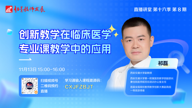 超星教师发展直播讲堂第十六季第八期特邀西安交通大学第一附属医院教学部副部长祁磊副教授,做题为《创新教学在临床医学专业课教学中的应用》的报告。