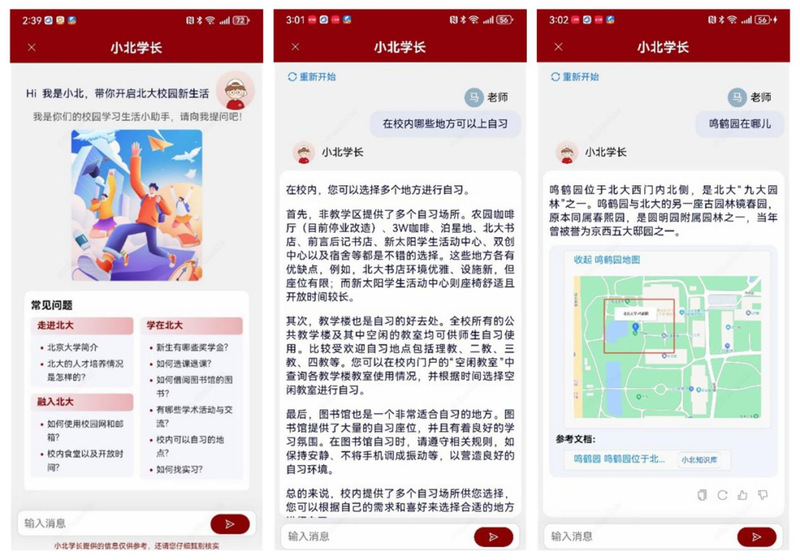 在北京大学计算中心的迎新现场,今年除了有广受学生好评的“小北学长”,还迎来了“新面孔”——北大学生自主设计的机器人。机器人拥有高超的对话交流能力,可为新生提供语音交互服务,发放专属资料袋。同时,“小北学长”这款AI智能校园学习生活助手,今年依旧持续发力,整合学校官网重要网页信息、各部门各类文档资料、校内常用位置地图等多种校内资源并形成知识库,为新生在学习和生活中遇到的各类问题提供精准、详实的解答。