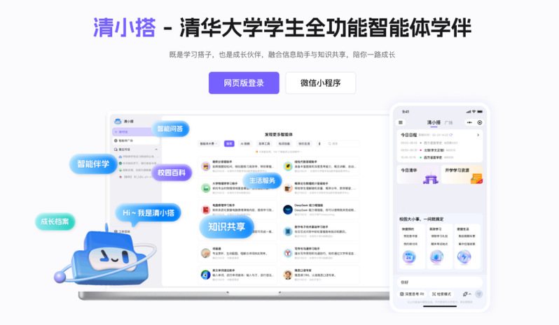 清小搭作为融合AI技术与校园场景的智能体,覆盖导学交流、学习科研、生涯规划等学生日常全场景。覆盖移动端与PC端,拥有中英双语版本,可7×24小时全天候响应新生需求。集成智能问答、深度思考、智能摘录、MCP工具箱等多种功能,真正实现信息枢纽的一键触达。“清小搭”还设有智能体广场,致力于为每位同学提供专属的全功能智能体学伴。目前广场已汇聚260+个学生与教师共同研发的智能体。此外,“学习发展路线图”“学业志趣评测”“图书馆资源”“清小搭成长报告”等众多实用资源也汇聚其中,覆盖学生学习生活的每一个场景。