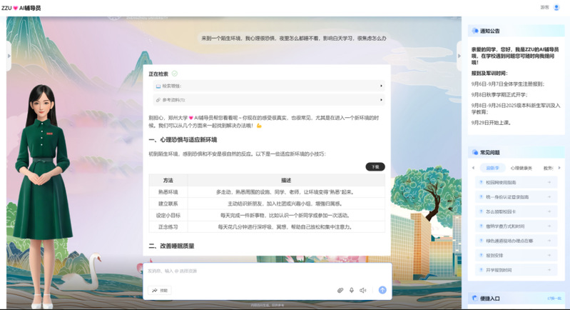 “AI辅导员”智能问答系统围绕“让每个学生更优秀”工作理念,构建“AI辅导员智能体+通用大模型+学生工作部专属知识库+校内公开知识库”深度融合的AI辅导员体系。以数字人的具身形象陪伴新生全周期校园生活。