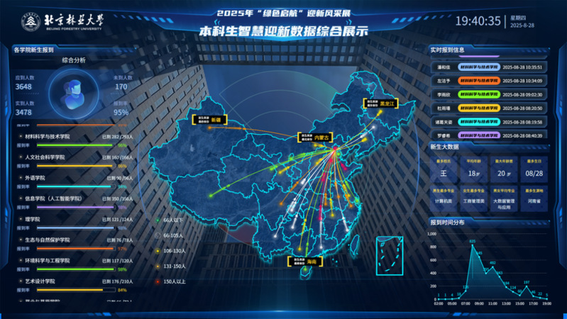 2025年北京林业大学推动信息采集、入学教育、资助服务等预报到和现场报到的线上全流程落地。北林APP上线校园VR导览功能,帮助新生尽快熟悉校园环境。本科生智慧迎新数据综合展示可视化大屏实时显示报到新生数据,让各学院新生报到人数、生源地等相关数据实时动态展示。多种风格的打卡留影互动区让众多新生驻足留念。北京林业大学通过多种数智化新方式,让新生报到可感可知并便捷高效。