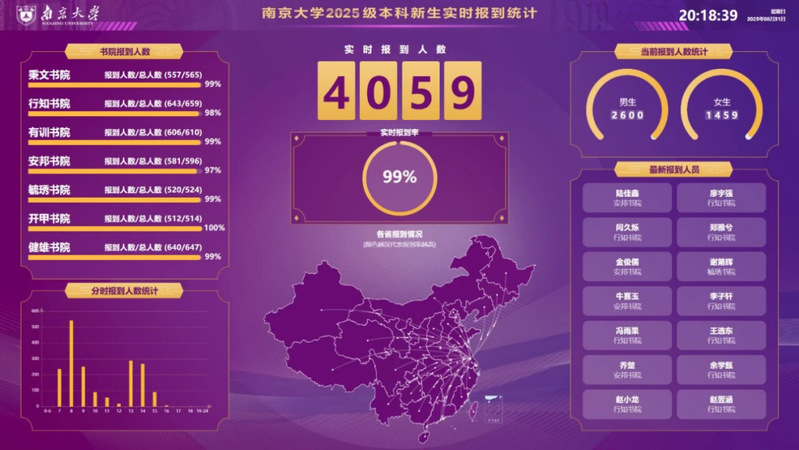 数字迎新启动前后,通过“华科大学工”微信推出含报到指南、政策解读、缴费操作、AI使用说明等内容的系列推文,经辅导员、志愿者精准转发,助力新生提前熟悉流程。针对往年大额缴费限额问题,学工部联合网信办、开发公司协商,推出拆分支付功能,满足新生缴费需求。开发线上报到“数据驾驶舱”,实时查看各院系报到进度与环节办理情况,方便学校掌握迎新进展、调配资源。