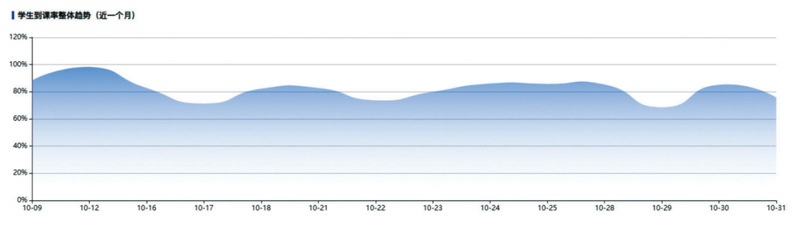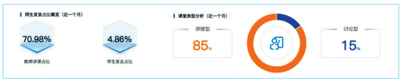 为多维度解析课堂效果,给授课老师和教学相关管理人员提供更直观的数据参考,团队引入AI技术,实时分析到课率(如图2)、抬头率和低头率(如图3)、师生发言占比(如图4)并形成图表供教师参考。同时,研究团队积极征求教师意见,持续优化相关参数,以最大限度地描绘课堂教学实际效果。