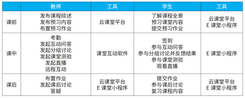 实践分为课前、课中和课后三个部分(见表1)。课前,授课教师通过云课堂平台向学生推荐课程相关学习资料,发布预习内容和预习作业,让学生的预习工作更具目标性。课中,教师可充分挖掘互动教学平台的功能,通过软件的互动功能对所有学生提问并发起分组讨论,及时了解学生学习状况,增强学生的课堂专注度。课后,智慧教育平台提供了完整的课程视频供学生反复观看,学生也可在智教云小程序向老师提问。对于有意深度学习的学生,老师也会在线上推荐相关书籍和课程视频。