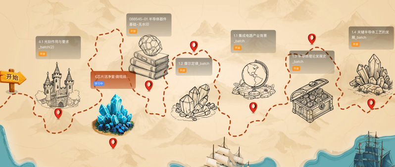 基于测评结果,AI从海量资源库中实时抽取、智能组装成完全个性化的学习单元与路径。每位学生都拥有专属的“学习地图”,学生可以通过闯关、探宝等不同模式自由选择学习。系统会根据学习进度动态优化路径,确保其始终贴合学生能力发展曲线。