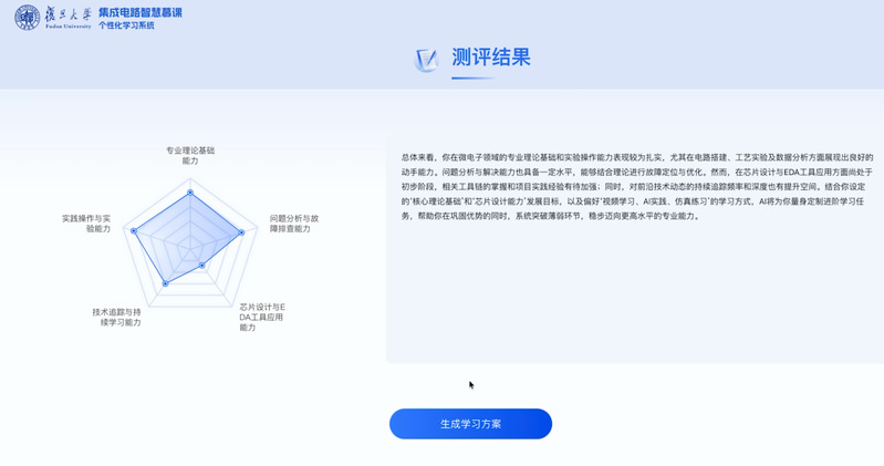 集成电路智慧慕课学习系统,通过智能评测与画像生成、动态路径与个性化组装、沉浸式实践与智能学习支持、成长追踪与目标管理四步路径,构建了一个“目标-评测-路径-实践-反馈”的智适应学习闭环。