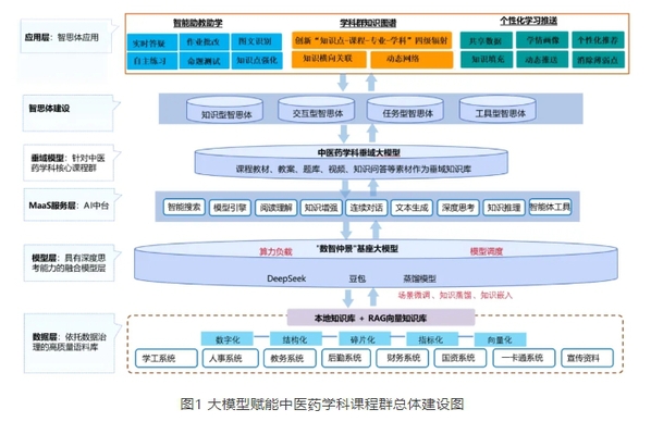 依托河南中医药大学的数据资源及前期数据治理成果,构建多模态语料库及“数智仲景”基座,打造中医药学科垂域大模型。在此基础上建设了“医典问对”“i中医”“智医通”“智护通”“仲景通”等智思体,实现中医药学科的智慧教学。大模型赋能中医药学科课程群建设思路如图1所示。