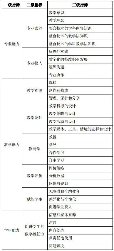 据此,将“教学资源”“教学设计”“教与学”“教学评价”“赋能学生”作为“教学能力”的5个二级指标。其中,“教学资源”包括“选择”“制作和修改”“管理、保护和分享”3个三级指标;“教学设计”包括“教学目标的设计”“教学策略的设计”“教学活动的设计和教学媒体”“工具和情境的选择及设计”4个三级指标;“教与学”包括“教授”“指导”“合作学习”“自主学习”4个三级指标;“教学评价”包括“评价策略”“分析数据”“反馈与规划”3个三级指标;“赋能学生”包括“无障碍和全纳教育”“差异化与个性化”“促进学生投入”3个三级指标。