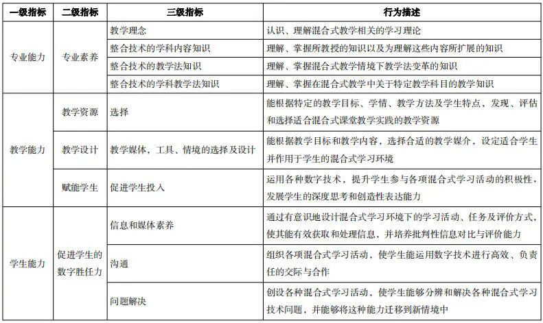 该模型系统地反映教师在混合式教学环境中所需具备的核心能力和具体行为特征,为教师的专业发展和教学质量提升提供科学依据。