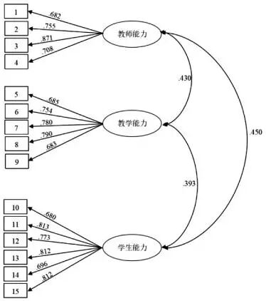为了验证探索性因素分析所得三因子结构的合理性,本研究使用AMOS软件对第二轮数据进行验证性因素分析,如图1所示。根据探索性因素分析抽取出的因子,构建“专业能力”“教学能力”“学生能力”三因子结构。三因子验证性因素分析结果显示,各项目因子载荷在0.68与0.87之间,且路径载荷均显著(p< 0.01),并且每道题所归属的因子与探索性因素分析结果一致,各项拟合指标良好,三因子模型拟合指数为:X2/df = 8.21,CFI = 0.95,TLI = 0.93,RMSEA = 0.04。这表明,本研究所设计的高校教师混合式教学胜任力模型与实际数据可以契合,模型整体达到较为理想的适配程度。