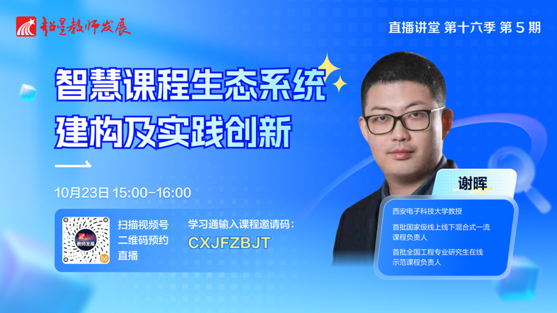 超星教师发展直播讲堂第十六季第五期特邀西安电子科技大学谢晖教授,分享题为《智慧课程生态系统建构及实践创新》的主题讲座。