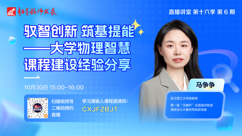 超星教师发展直播讲堂第十六季第六期特邀武汉理工大学马争争副教授,作题为《驭智创新筑基提能——大学物理智慧课程建设经验分享》的主题报告。