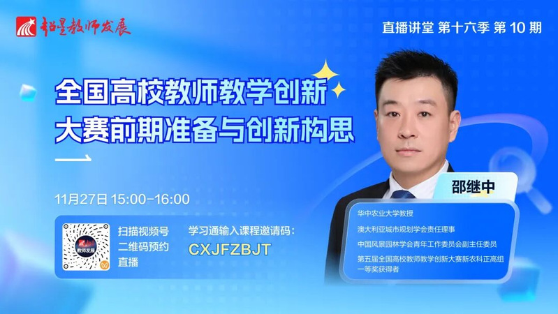 超星教师发展直播讲堂第十六季第十期特邀华中农业大学邵继中教授,做题为《全国高校教师教学创新大赛前期准备与创新构思》的报告。