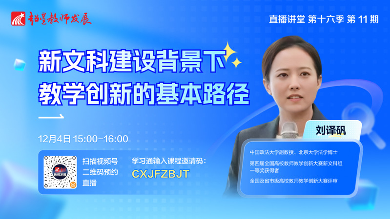 超星教师发展直播讲堂第十六季第十一期特邀中国政法大学刘译矾副教授,做题为《新文科建设背景下教学创新的基本路径》的报告。