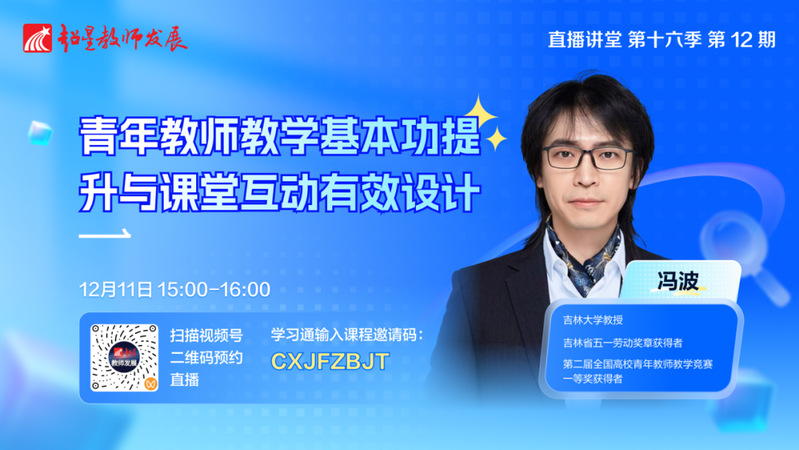 超星教师发展直播讲堂第十六季第十二期特邀吉林大学冯波教授,做题为《青年教师教学基本功提升与课堂互动有效设计》的报告。