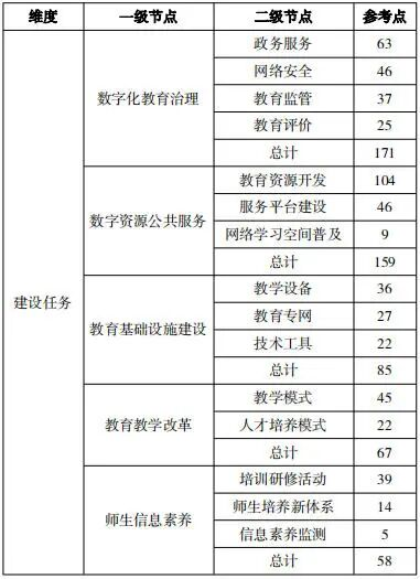 建设任务维度指促进教育数字化发展所采取的软硬件方面的举措,主要包括教育基础设施建设、数字化教育治理、教育教学改革、数字资源公共服务、师生信息素养五个一级节点。教育基础设施建设节点包括技术工具、教学设备、教育专网等内容;数字化教育治理节点包括政务服务、教育监督、教育评价、网络安全等内容;教育教学改革节点包括人才培养模式、教学模式等内容;数字资源公共服务节点包括服务平台建设、教育资源开发、网络学习空间普及等内容;师生信息素养节点包括培训研修活动、师生培养新体系、信息素养监测等内容。