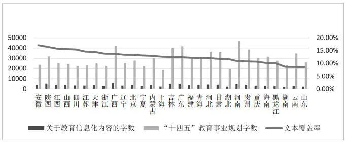 省级政府发布的《规划》政策文本中描述“教育数字化”相关内容的文字数量多少,能够反映省级政府在“十四五”时期对于教育数字化建设的注意力配置程度。文本覆盖率指对研究对象的相关表述字数占研究文本总体字数的比率,文本覆盖率的高低能表征出发文机构对相关工作的关注和重视程度。选择各省级政府《规划》中有关教育数字化的内容,计算出教育数字化相关内容占总体内容的比率,即本文所指的文本覆盖率。各省级政府的文本覆盖率结果通过柱状图和折线图的组合形式呈现出来,如图1所示。