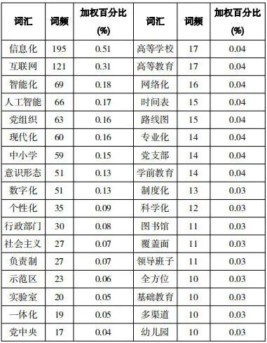 词频分析是对文本中重要词汇出现的次数进行统计与分析,是文本挖掘的重要手段。词频分析的原理是通过词汇出现的次数多少,确定文本内容的重点和热点,及其变化趋势。本文将省级政府《规划》中教育数字化的相关内容提取出来,导入到NVivo11plus软件中,运用词频查询功能对高频词汇进行分析。在词频查询过程中,将字词的最小长度值设置为3,选取加权百分比0.03%以上(包含0.03%)的词汇。为了提取有意义的高频词汇,本文剔除“进一步”“各负其责”“齐抓共管”等词汇,最终获取34个高频词汇,如表3所示。